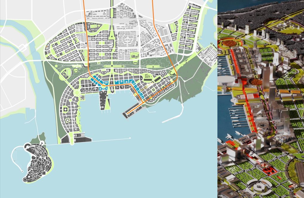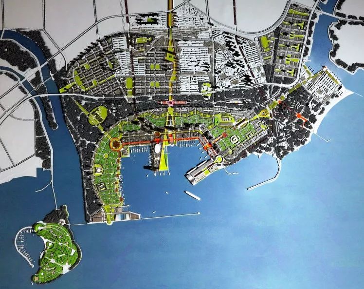 交通方面,架构连接国际邮轮港与高铁车站的城市快速公共交通环线。利用已有铁道,开辟连接城区、海螺岛及森林公园活动的风景线观光小火车。同时,建构连接邮轮港、城市电车车站,服务滨海开发街区的接驳公交环线。