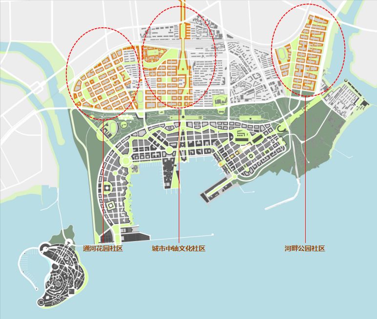 城市森林公园以北,构建三个特色社区,一个是河畔的公园社区、通河的花园社区,一个是中轴文化社区。